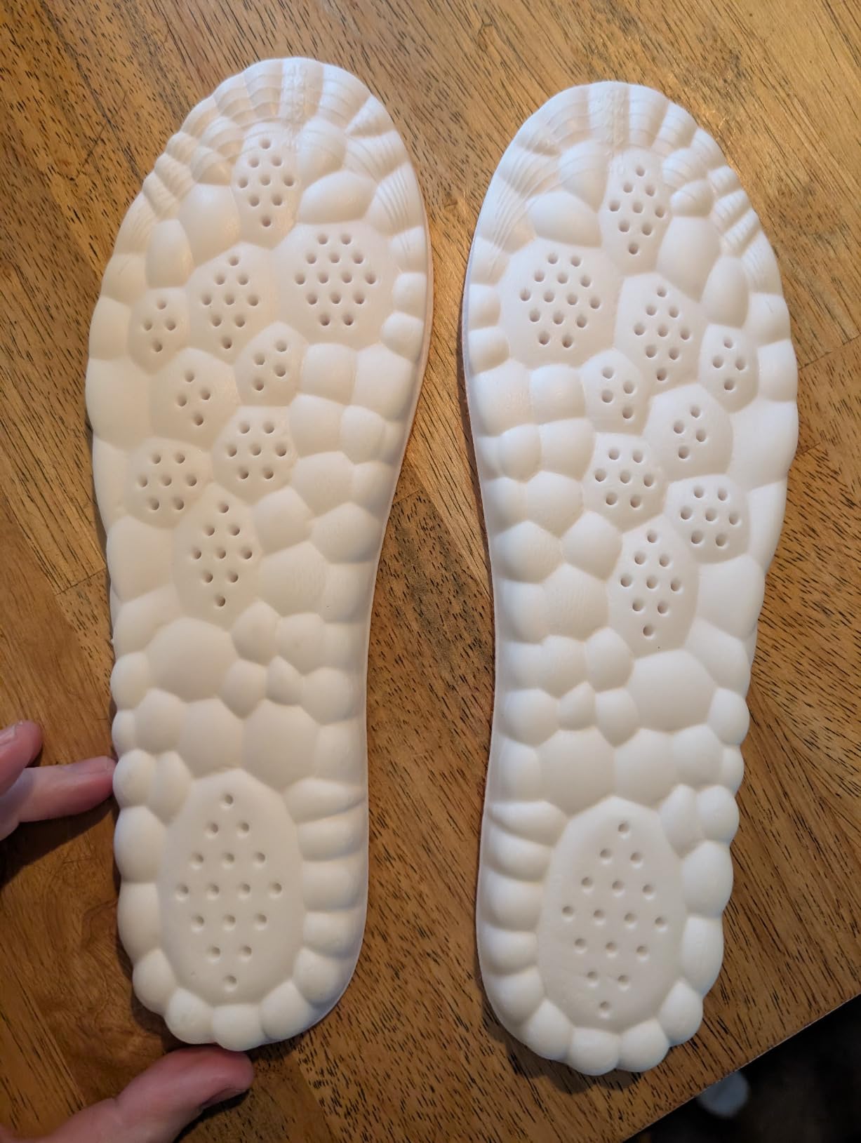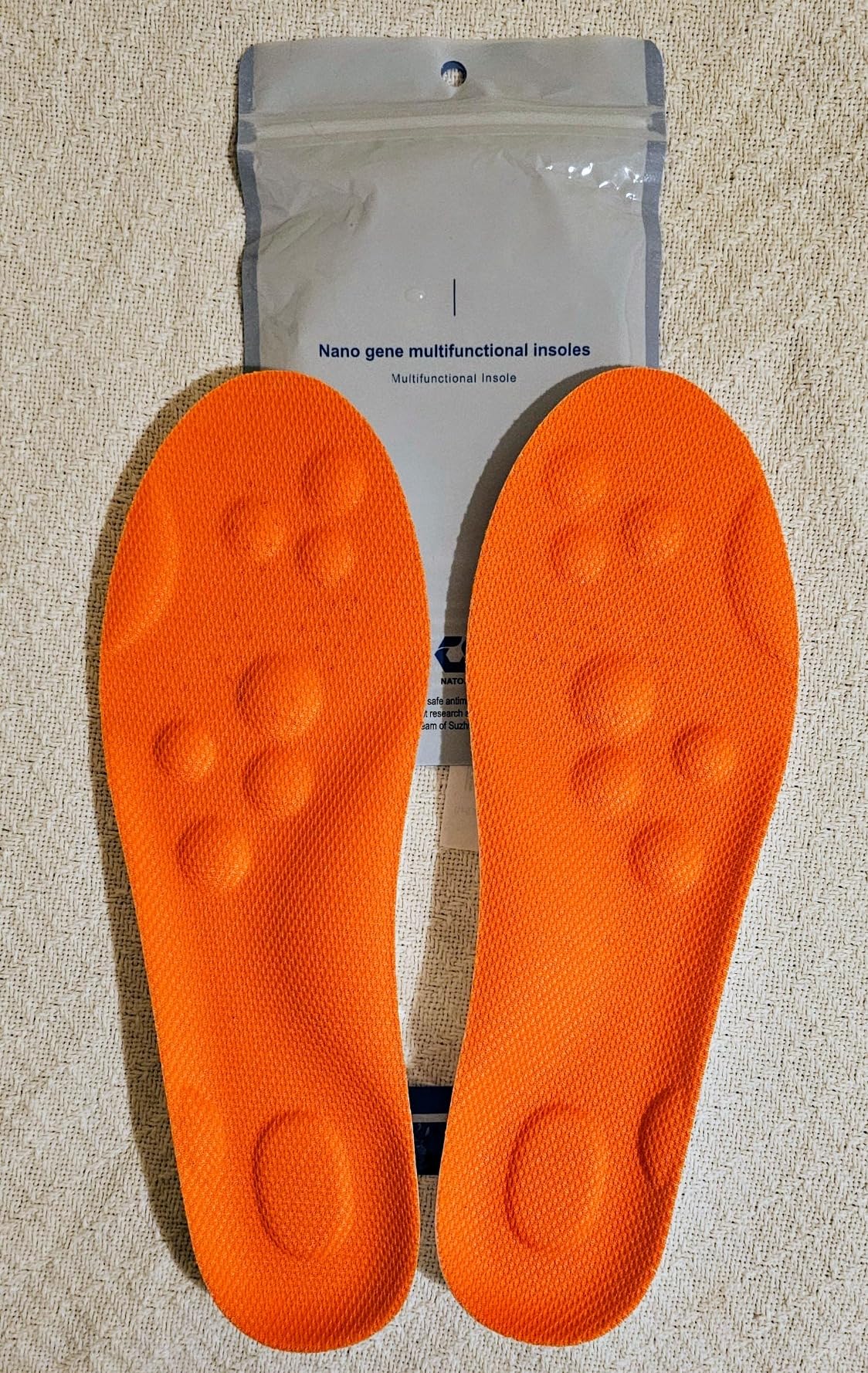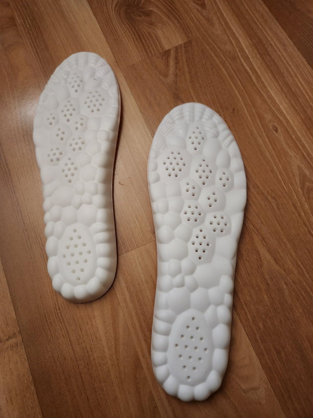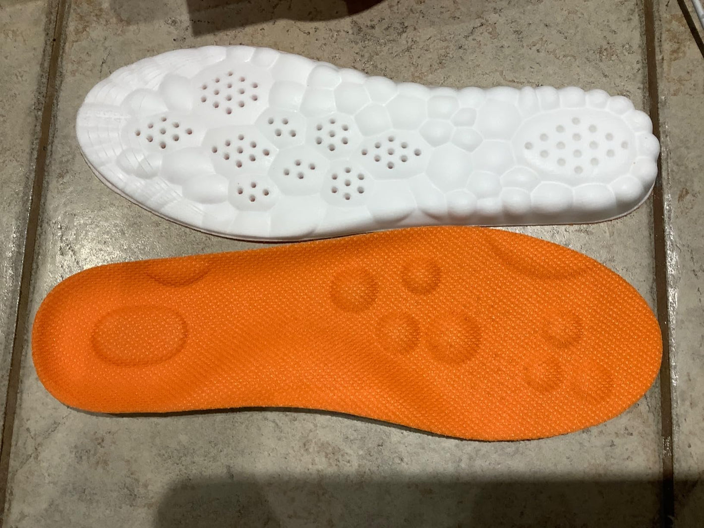 Trim along the indicated lines for size — fits most sneakers, boots, or casual shoes. Use both insoles to test.
